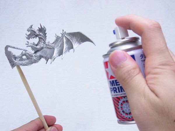 メタルプライマーをメタルフィギュア全体に吹き付けることにより、金属の表面に薄い樹脂の膜が形成されます。